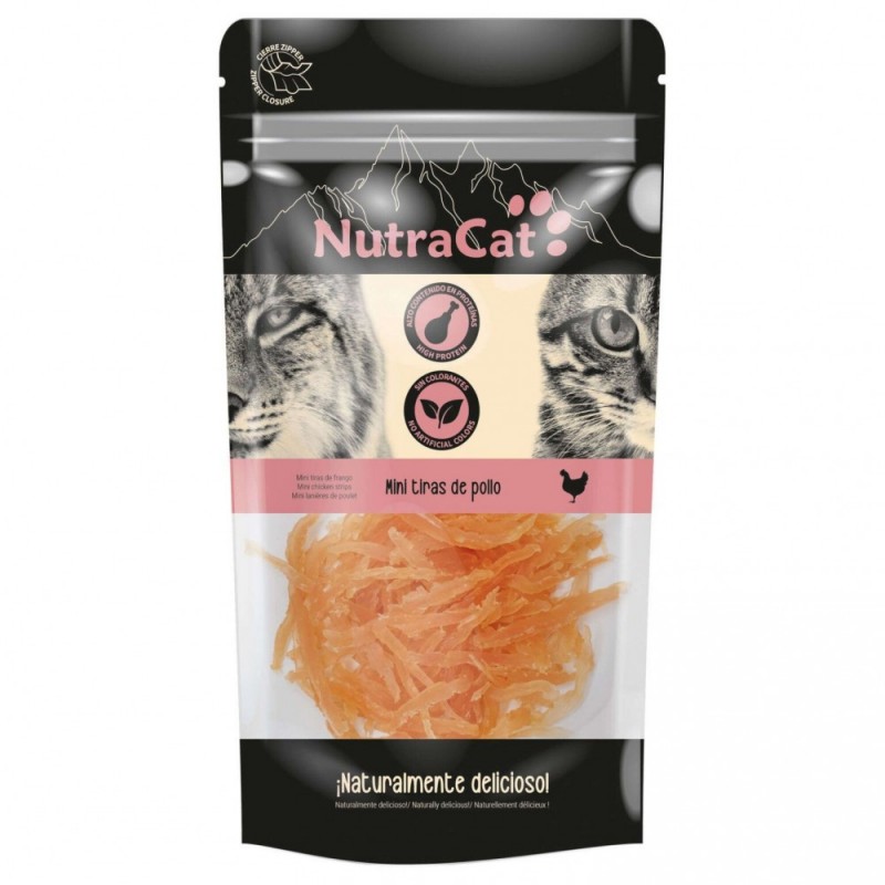 Mini tiras de pollo de NutraCat, sabrosas pero sobre todo saludables, sin colorantes artificiales y gran aporte de proteínas de gran calidad. El cierre zip ayuda a mantener el snack fresco como el primer día, a tu gato le encantará.