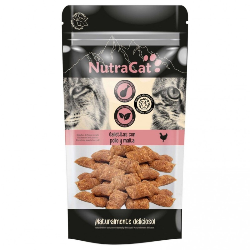Crujientes galletitas para gatos rellenas con pollo y malta NutraCat, un snack delicioso que reduce los problemas de bolas de pelo. Cada bolsita lleva cierre zip que ayuda a mantener más tiempo el frescor.